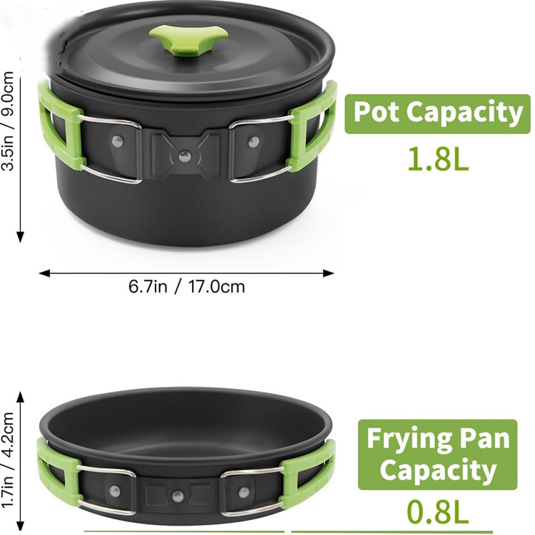 16 дана лагерьде ыдыс-аяқ, кемпингке арналған ыдыс-аяқтар кастрюльге арналған кастрюль. Осы 16 бөліктен тұратын кемпхана жиынтығына кастрюльдер, табалар, кубоктар, табақтар және ыдыс бар. Кешенді кемпингтік тамақтануға арналған, ол шөл далада тамақ дайындауға және тамақтануға қажетті барлық нәрсені қамтамасыз етеді.