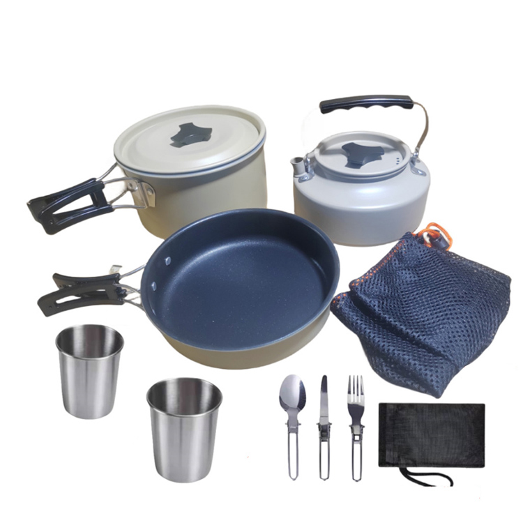 Шайнектің потенциалды пісіру кемесімен қондырғы жиынтығы. Бұл алюминий лагерьде ыдыс-аяқ жиынтығы жан-жақты шайнек және бірнеше пісіру кастрюльдерін қамтиды. 3-4 адамға тиімді қызмет етуге арналған, ол жеңіл төзімділікті сыртқы сыртқы көрсеткіштермен біріктіреді.