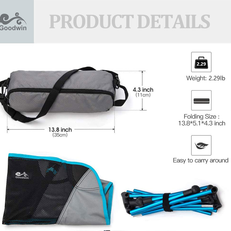 Ультра жеңілдетілген порельдік ықшам жиналмалы жиналмалы жиналмалы капсандар. Қолайлы сақтау сөмкесімен ықшам және оңай тасымалдау оңай, ол жағажай сапарларына, кемпингке, рюкзакқа, серуендеуге, серуендеуге немесе кез-келген сыртқы приключенияға өте ыңғайлы.