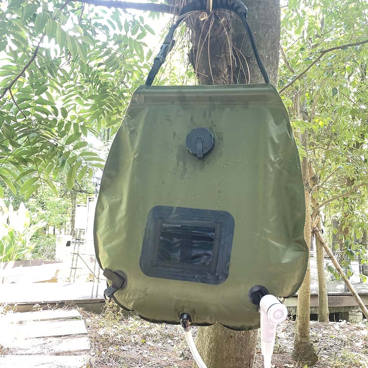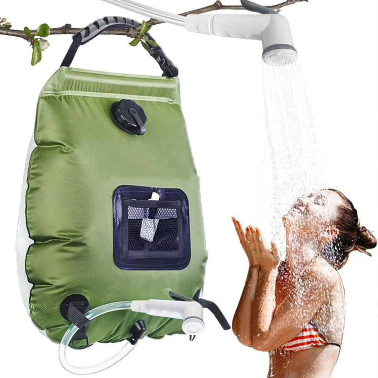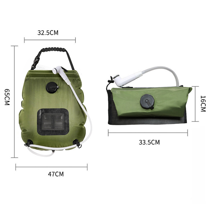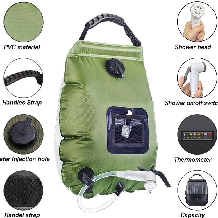 Күндізгі портативті лагерь жылу лагері душқа арналған душқа арналған сөмке. Бұл күн душ сөмкесі лагерьге ыңғайлы 5 галлон / 20л жылу суын ұсынады. Күн энергиясын қолдану, ол жылалудың кез-келген жерінде жылы, сергітетін жағдайды қамтамасыз етеді.