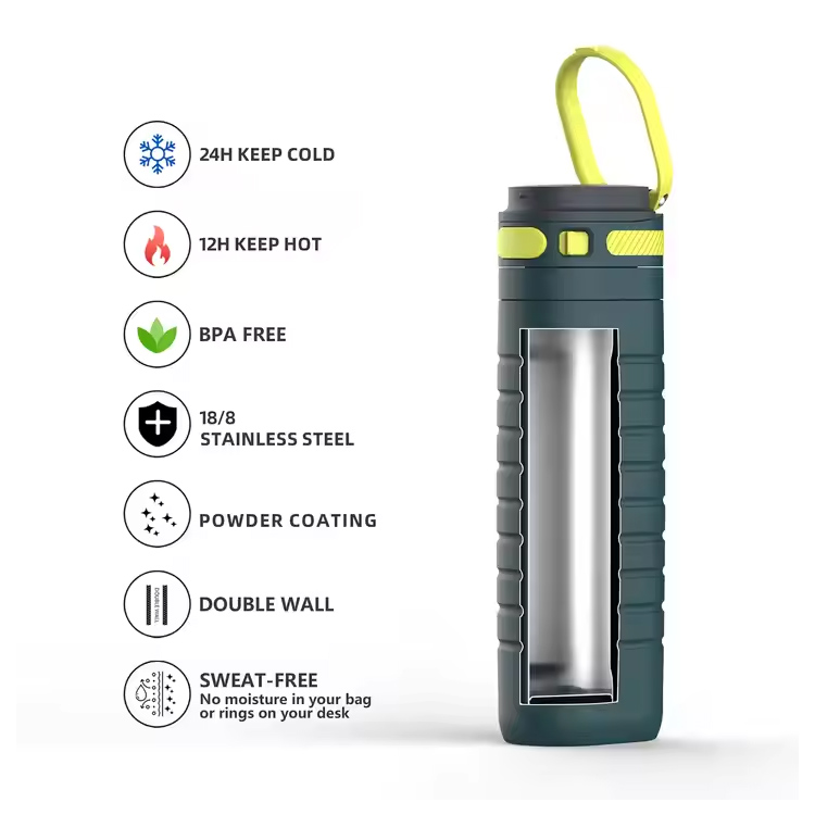 Қауіпсіз құлыптау механизмі мен силикон тығыздағышымен, бұл бөтелке 100% ағып кетеді және саяхат, рюкзактар немесе спорт залы үшін өте ыңғайлы. Интеграцияланған тасымалдау циклі портативті және стильді қосады.